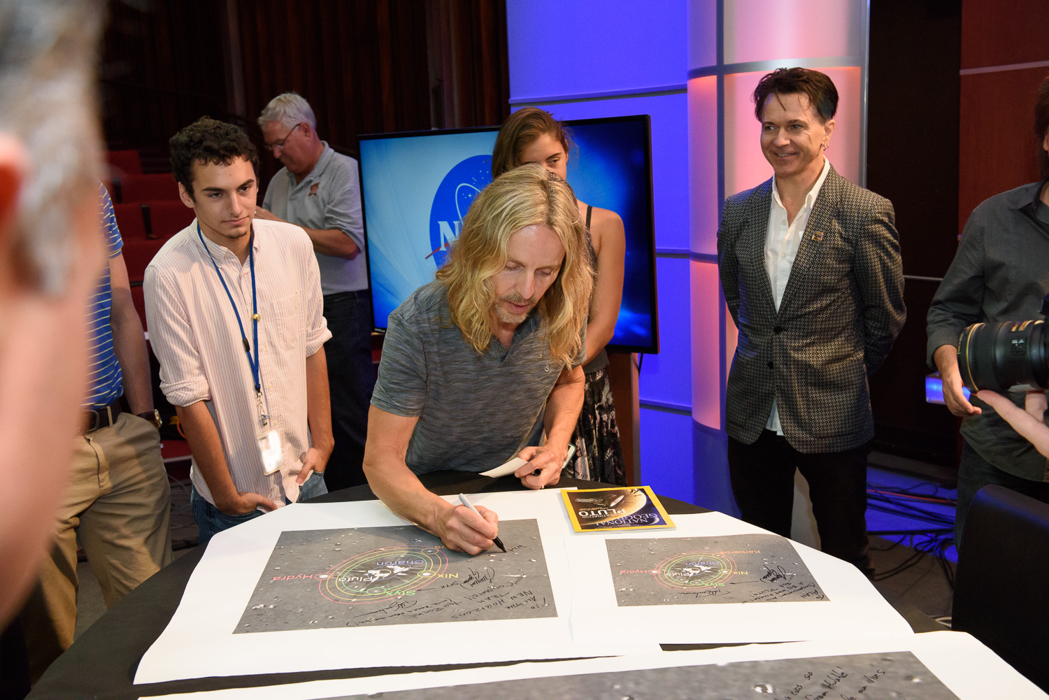 | Tommy Shaw signs a portrait of the Pluto system, used for the recently concluded hazard search. |
