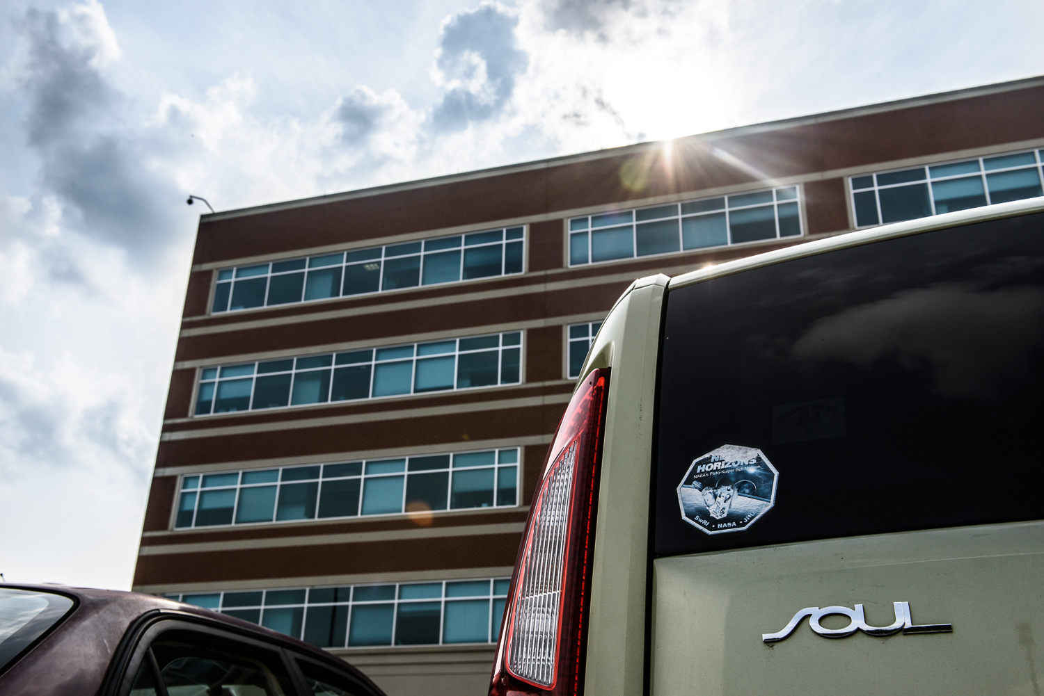 | New Horizons team outside Building 100. This was just after Ed White shot the team 'Thank You' shot from APL's cherry picker. Michael Soluri advised me 'I'm going to be in New York, but you should get a nice group shot. Make it back-lit -- shoot right into the sun.' So I grabbed everybody as they were trying to run back to their offices from being outside for long enough already. "You have two minutes," said Alan. This was a panorama of about 30 shots, stitched together. And that's Ed White on the left, also shooting the whole group at the same time. |