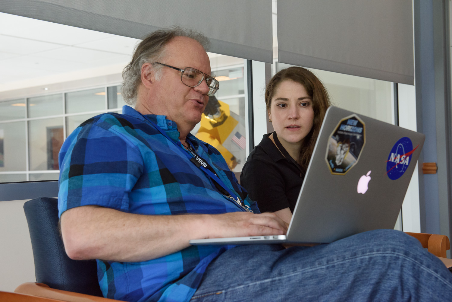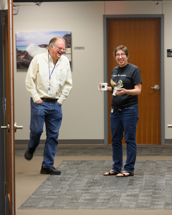 | Photographer Kyle Cassidy came by and shot some fantastic portraits of the New Horizons team for Slate. Here he's with Kelsi Singer. From Kyle's blog entry: "My Leica was a point of continual interest among the scientists and engineers. One asked if I built it. The optics team discussed, at great length, how modern lenses are built to disperse less light in the rear optics of because of the digital sensors." |