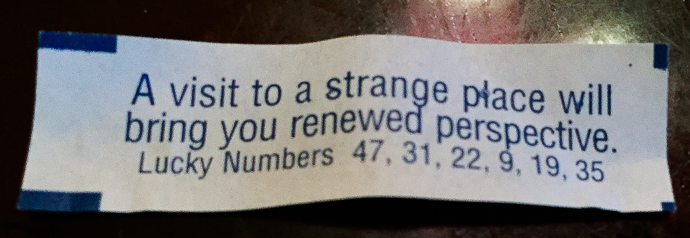 | Appropriate fortune cookie message from dinner. Photo taken by (and cookie eaten by) John Spencer. |