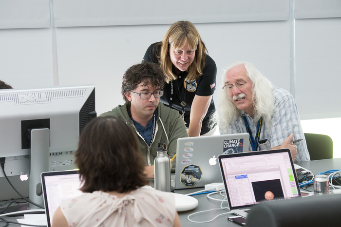 | Maarten Versteeg, Mark Tapley, Cathy Olkin, and Kim Ennico in the payload room. |