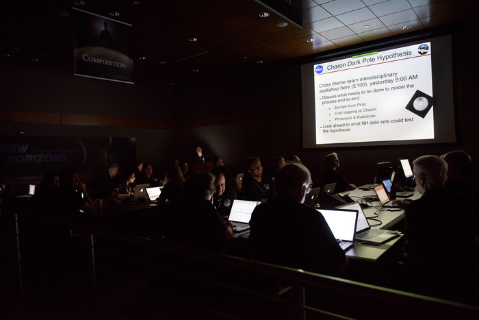 | Dennis Reuter, Will Grundy, and Dale Cruikshank wordsmith over a press release on that color MVIC map. The draft reads "Pluto, Charon Shine in Exaggerated Color", which was changed to "false color" by the time it made it into the (real release) on the day of the flyby. "But the colors aren't false -- they're at the right wavelengths, just exaggerated!" |