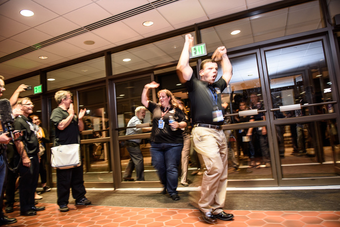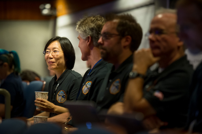 | Mission controllers and engineers from Mission Ops file into the Kosiakoff Center to much applause. |