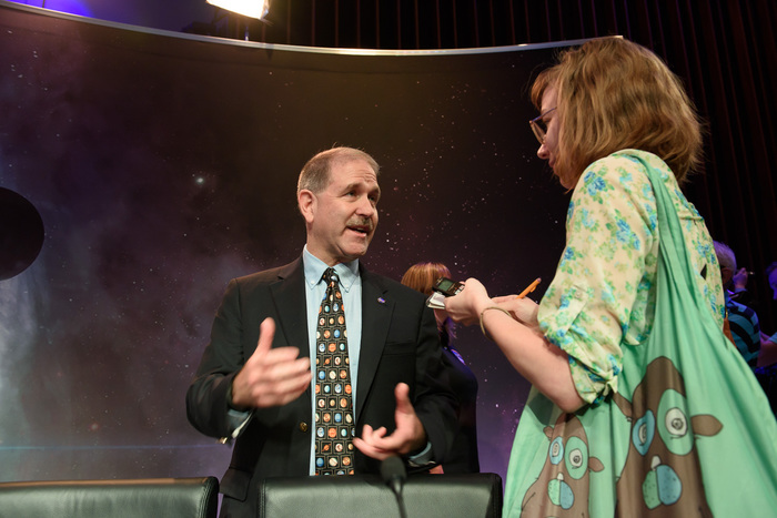 | John Grunsfeld takes questions from a reporter. |