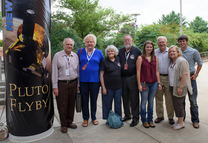| It's Jim Christy (discoverer of Charon) and Charlene Christy (namesake of the moon)! I talked with Jim for quite awhile. And Charlene and I go back a long time: at the Pluto launch in 2006, Leslie Young took the opportunity to decorate my head like a surface map of Pluto, using the best-available data at the time. In one of the highlight of my scientific career, I talked Charlene into orbiting me. here and here. |