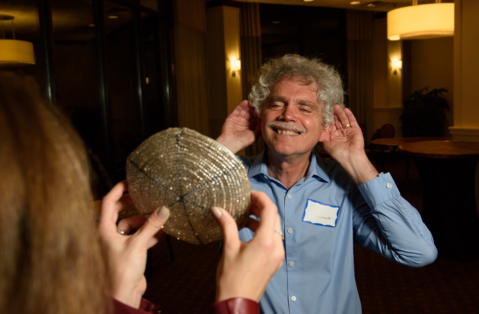 | In the Atmospheres room, Michael Soluri documents as Randy Gladstone and ___ show an Alice spectrum to science writer Ron Cowan. |