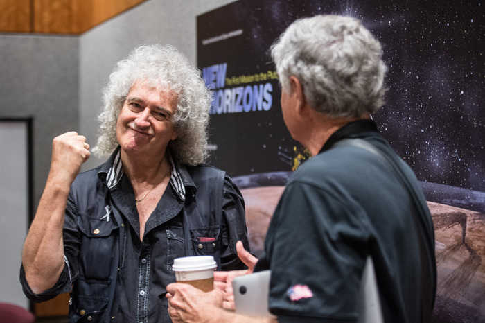| Alan Stern, Brian May, Hal Weaver. Brian May took a couple of years off from academia to play in a band, but eventually returned and finished his PhD in astrophysics at Imperial College London in 2007. |
