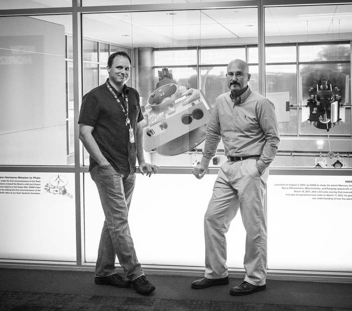 | Gabe Rogers and Chris Hersman, with New Horizons. (And that's MESSENGER just to the right, which successfully crashed into Mercury in 2015.) |