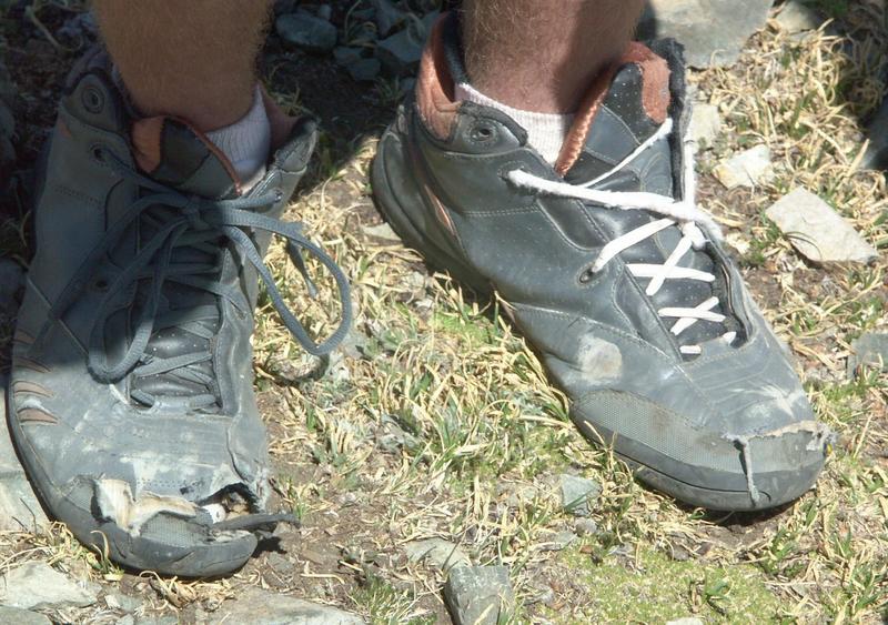 A Boy Scout mail-room employee from a local camp shows off his footwear for his 30-mile, two-day hike.