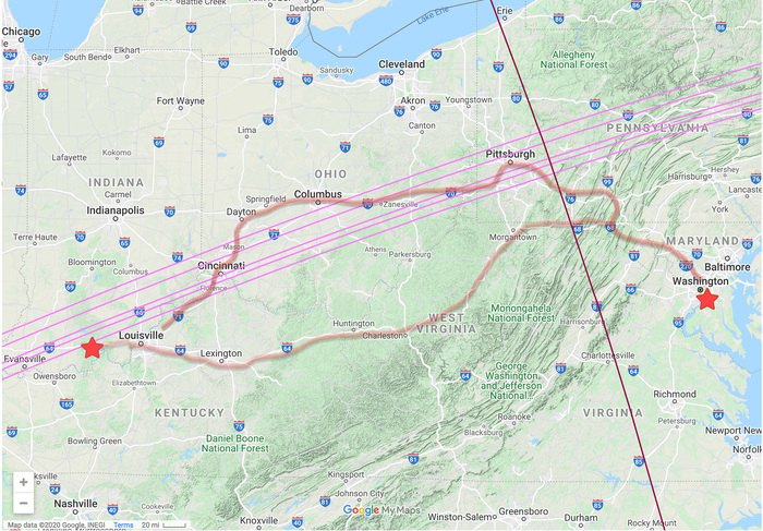 | At T-2 days, the weather looks pretty bad along our whole line! In fact, it looks like one could drive 1000 miles, from Massachusetts to Texas, and not hit clear skies until El Paso. |