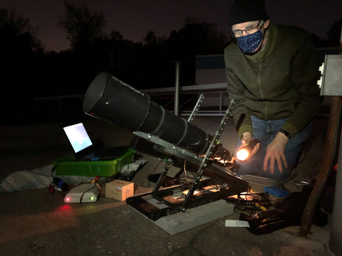 | I picked up the telescope and camera from Joan and Doug Dunham, who live not far from me near DC. They are the founders of the IOTA = International Occultation Timing Association -- the amateur group which has been responsible for the vast majority of the asteroid occultations every observed. How many have they observed? "Oh, I don't know. Maybe 2000 or 3000? We observe a lot of bright ones from our driveway. And we have a darker site in Arizona that we get some faint ones from." They have a 16-inch SkyWatcher at both locations. I had two practice nights with the Dunhams, to find the field on the sky. The occultation star is 17th magnitude -- it's very faint, and only visible in a long exposure (6 seconds from the DC metro area!). |