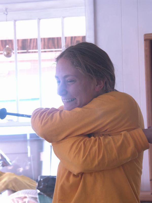 Steph tries Ed's ski pole trick (`Arms crossed; palms up.').