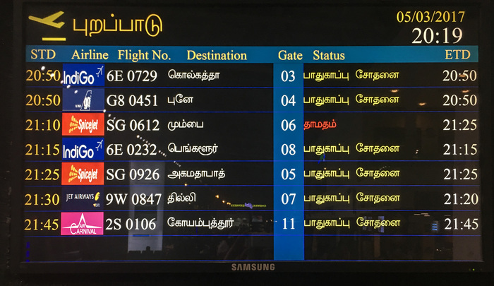 | I will never tire of staring at airport destination displays! This one is in Chennai, and that script is Tamil. |