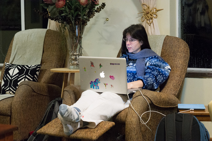 | Encarni Romero Colmenero's purple & blue unicorn clearly beats the designs in any of Apple's recent sticker commercial. Encarni is one of the six SALT astronomers -- in fact, the first one. Oh, what are we doing here? It's night time but everyone's at the hostel? Must be those clouds, or the wind, or... |