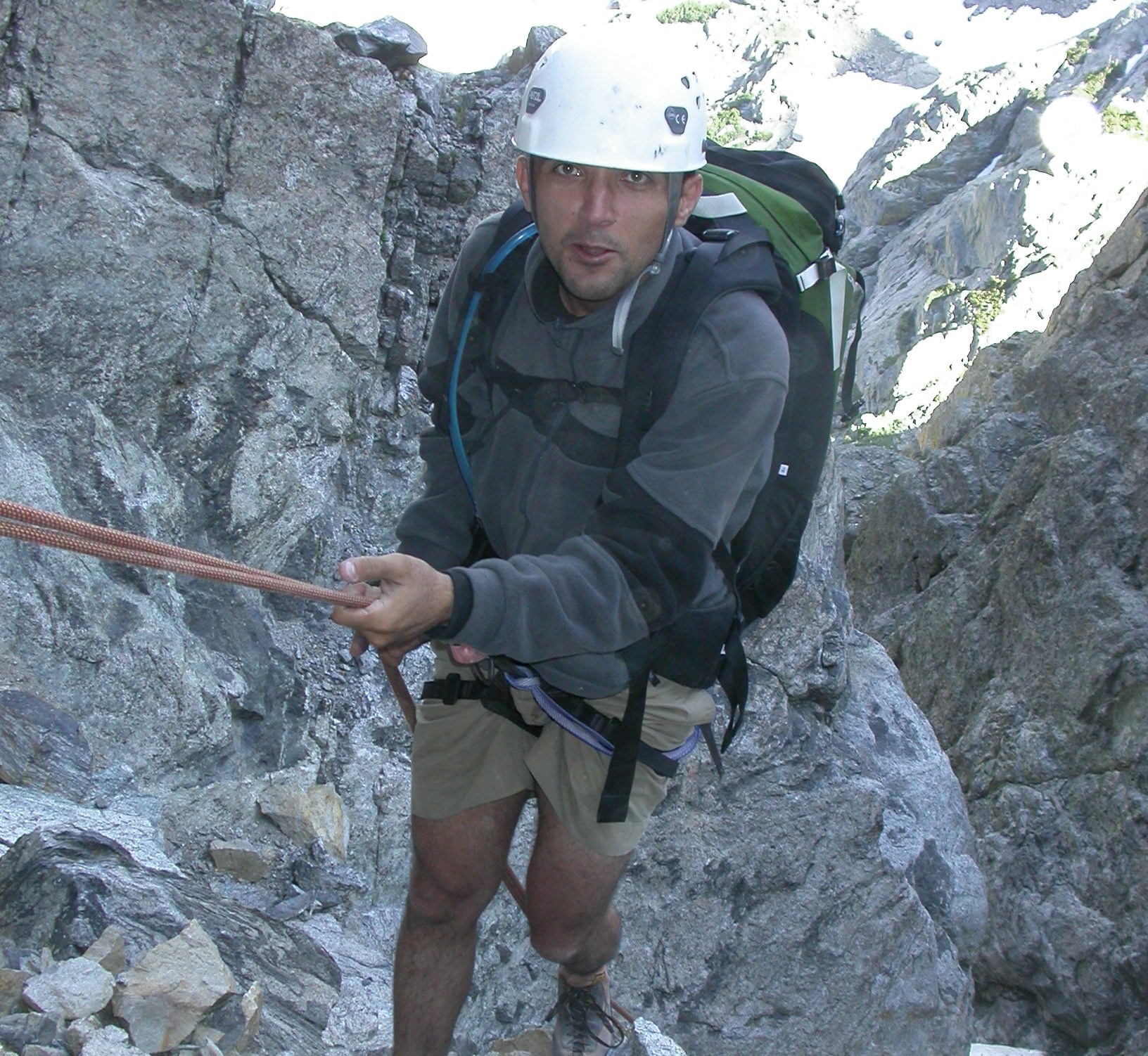 Fathi rappels over a chockstone reminiscent of that in an elevator shaft in Alaska...