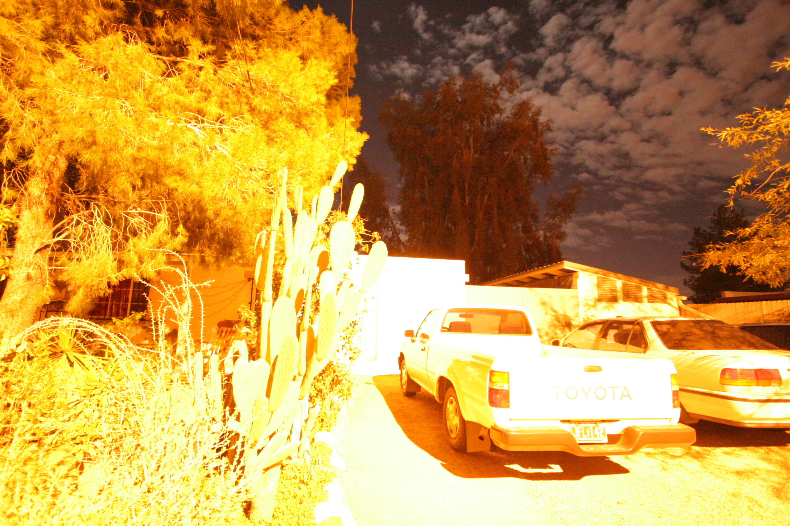 Vehicles on S. Bryant Ave are lit brightly in the flare of sodium.