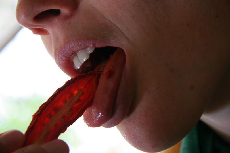 HLT demonstrates proper use of her new sun-dried tomato action figures (courtesy of JMT's garden and the historic drier).