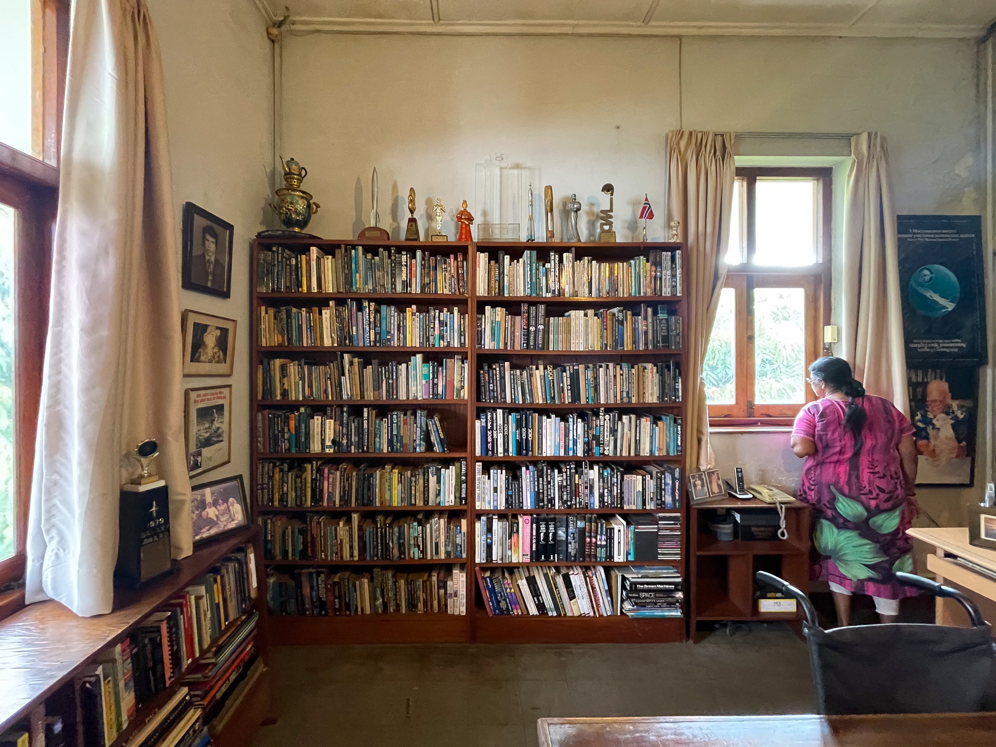 The house is not technically a museum, but (like many things in Sri Lanka) it's been preserved essentially untouched, in this case since ACC died in 2008. The housekeepers walked me through a tour right up to his office, filled with books, VHS tapes, signed photos, and space trinkets. Of the 1000-odd books, Clarke wrote about half himself - certainly some kind of record. Downstairs is a cemetery where his dogs are buried (8 chihuahuas!); his two turtles currently roam in the grass, and a now-huge fish swims laps inside a modest tank.