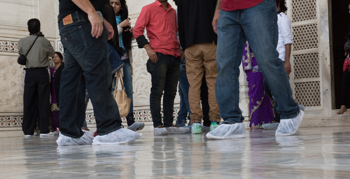 | Shoe covers are mandatory inside. Most people use the standard-issue ones, although some bring their own. |