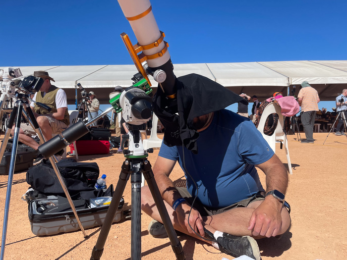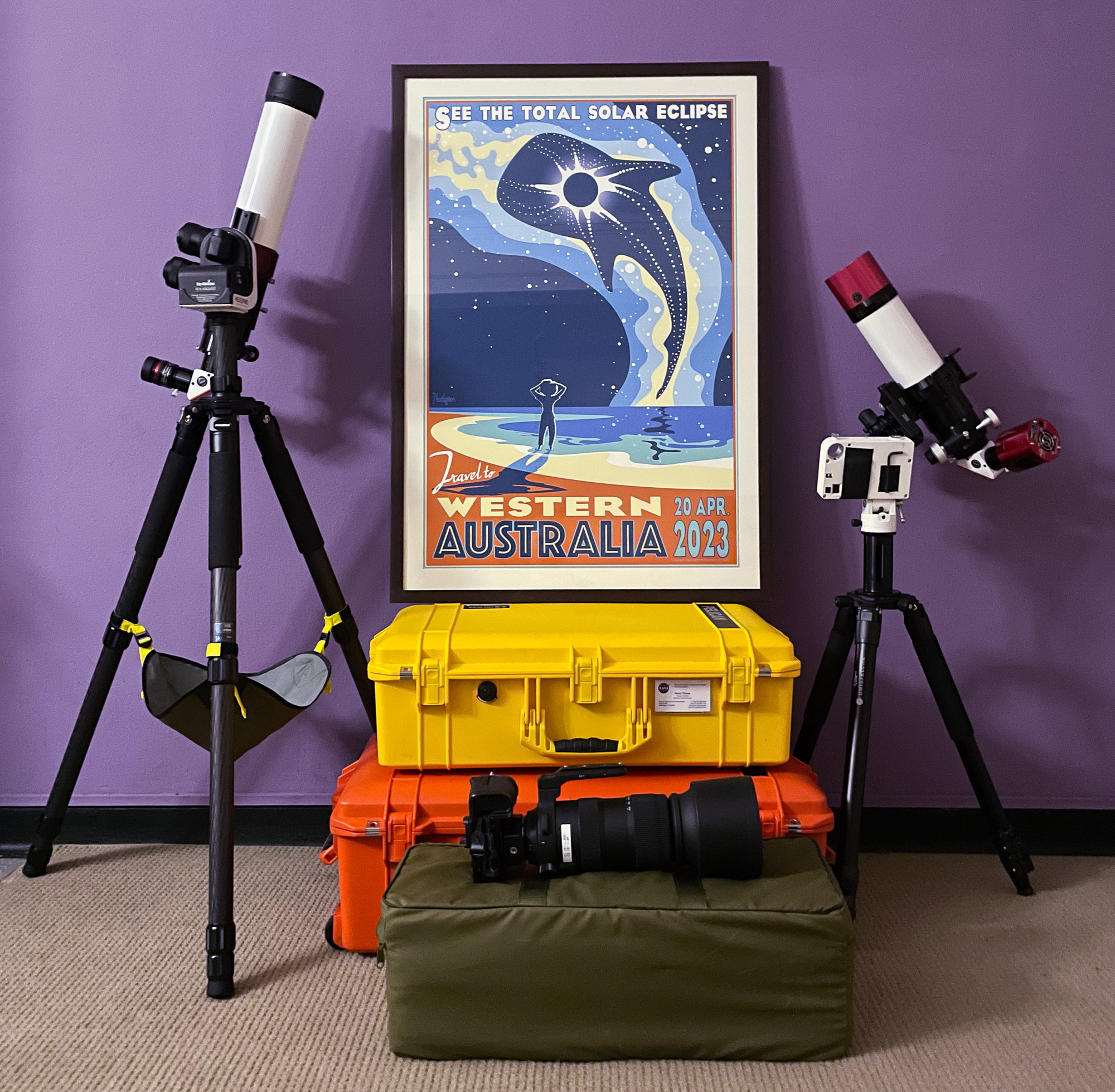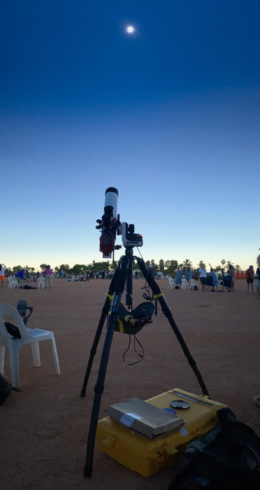 | OK, I've been getting ready for this eclipse for most of a year. I've beefed up my solar telescope collection: here's two solar telescopes, plus a Unistellar eVscope I figured I'd use during the evening with the group, plus a big camera. The poster is one by my friend Tyler Nordgren, a full-time outreach asteronomer who has run astronomy programs in many of the US's national parks, and was planning to be in East Timor for this 2023 eclipse as a guide. |