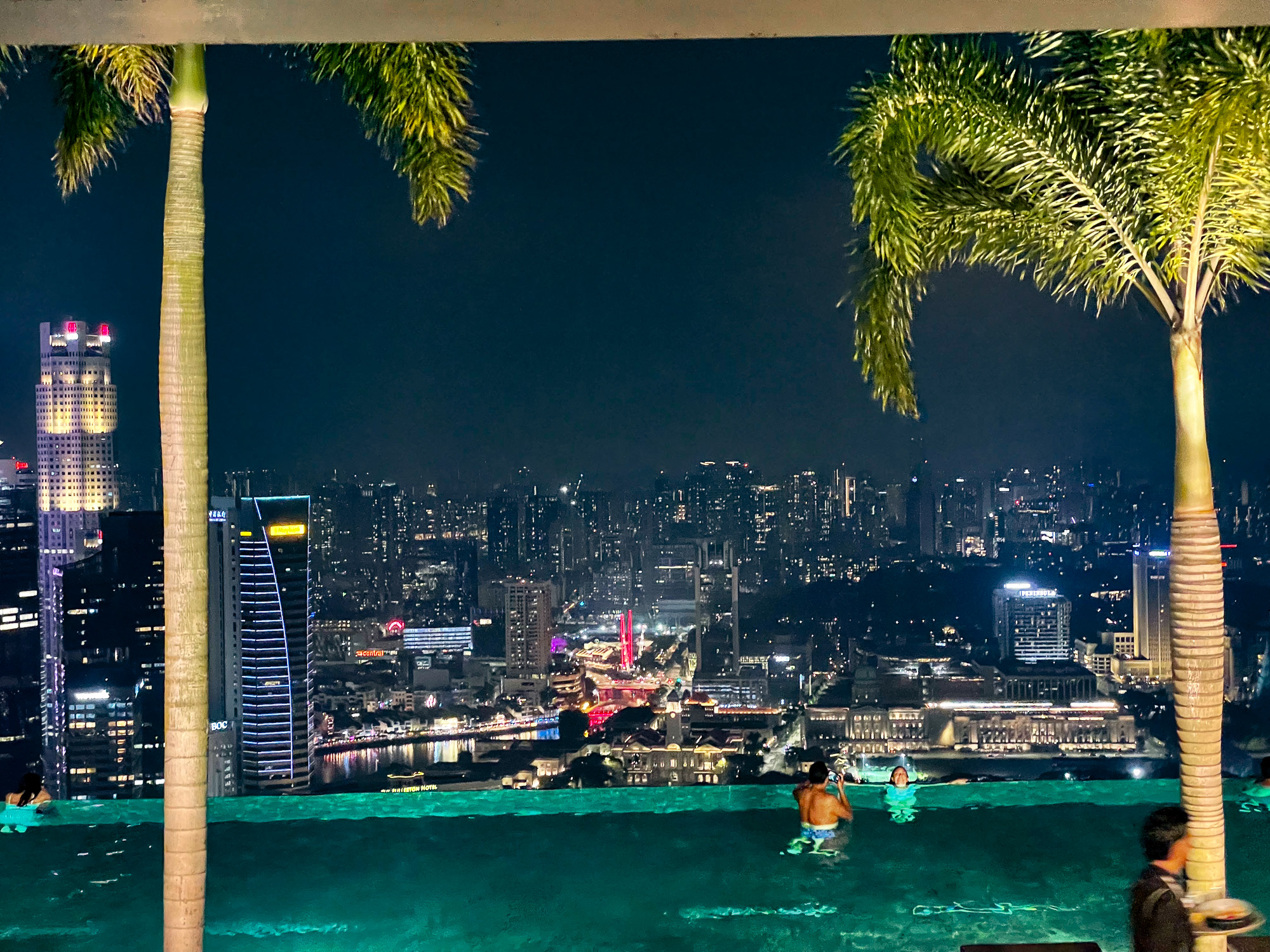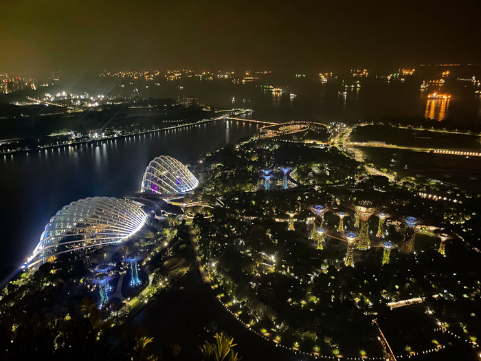 | ... and to the top of the Marina Bay Sands hotel -- the giant three-pillared one with the pool up top. No, they would not let us in the pool... but we did have a beverage at the bar. |