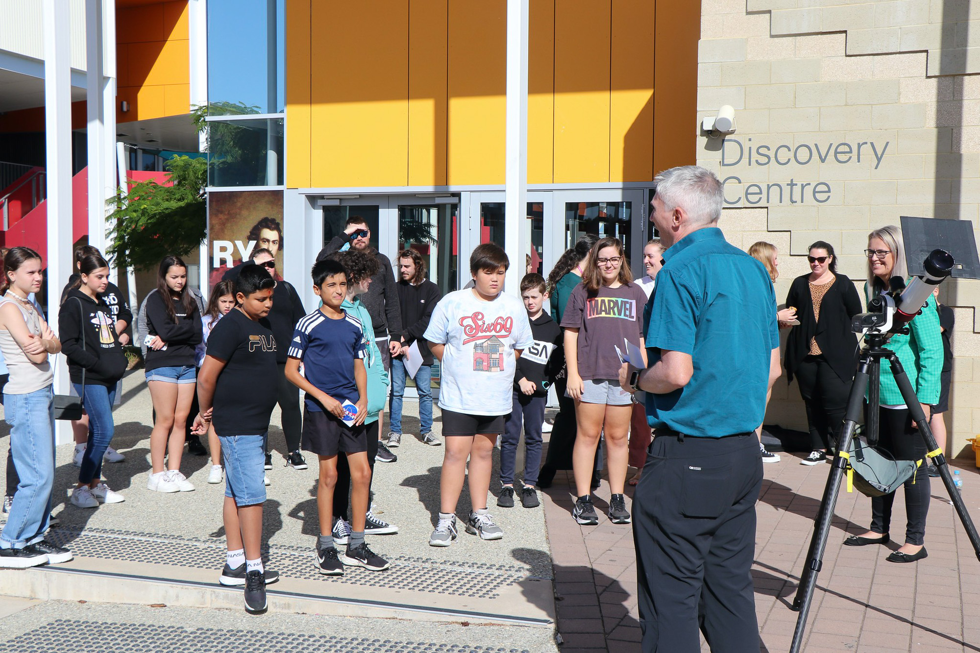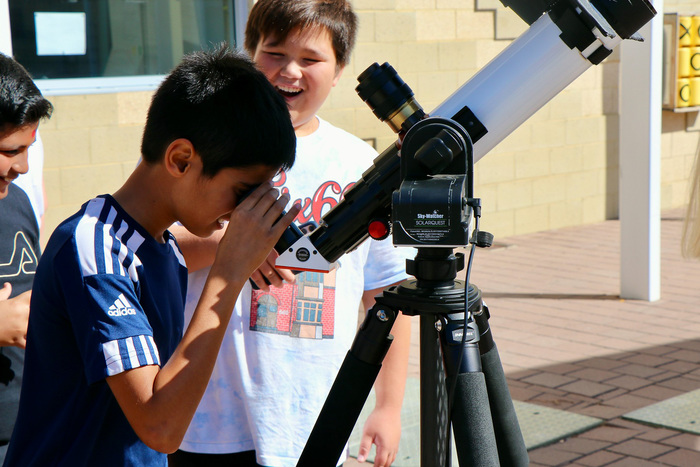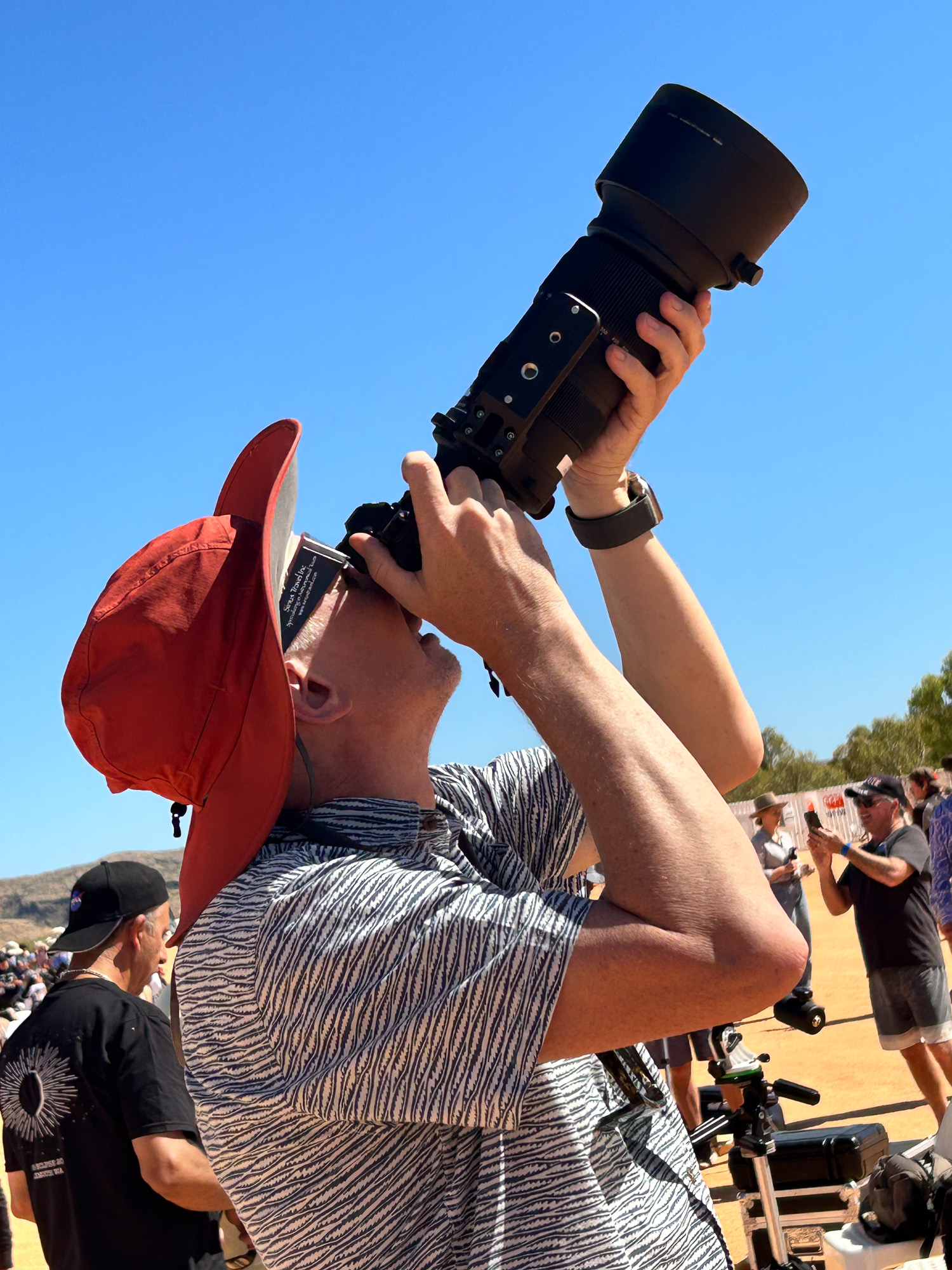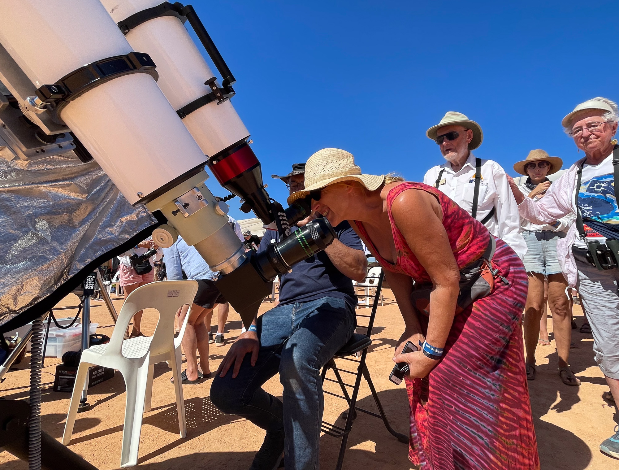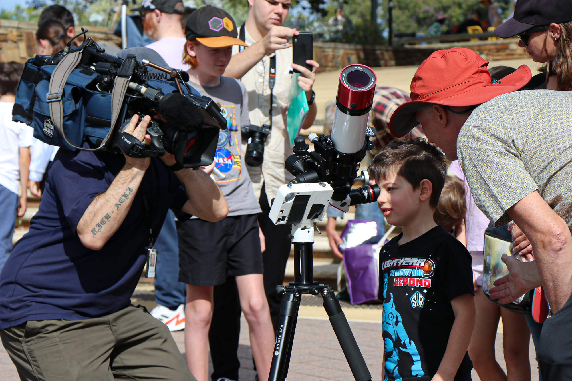 | TV crews filming at the star-party in Perth. This student is looking at the sun in H-alpha, through one of the Lunt solar telescops I've brought. |