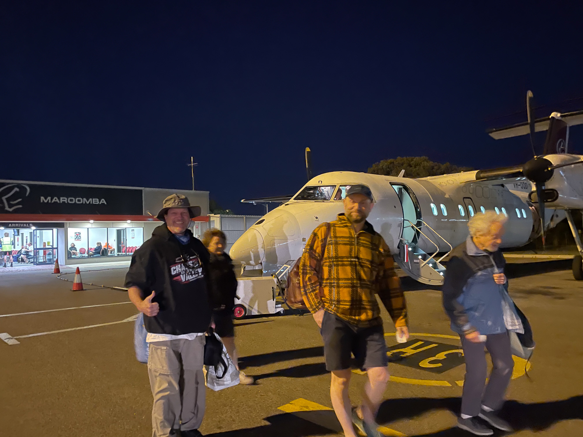 | Heading back to Perth! An hour earlier, we were told to stay inside because of a dangerous snake that had been seen. But now our plane is here, and the snake is gone, so goodbye Exmouth! |