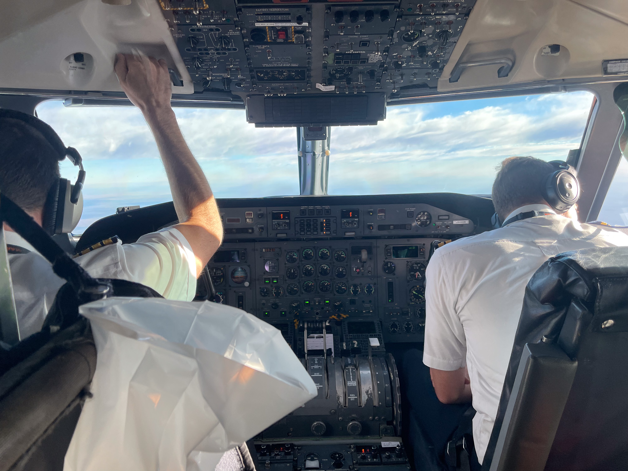 | The pilots of our 50-seat jet. It's a 3-hour flight to the tiny military airport at Exmouth-Learmonth. |