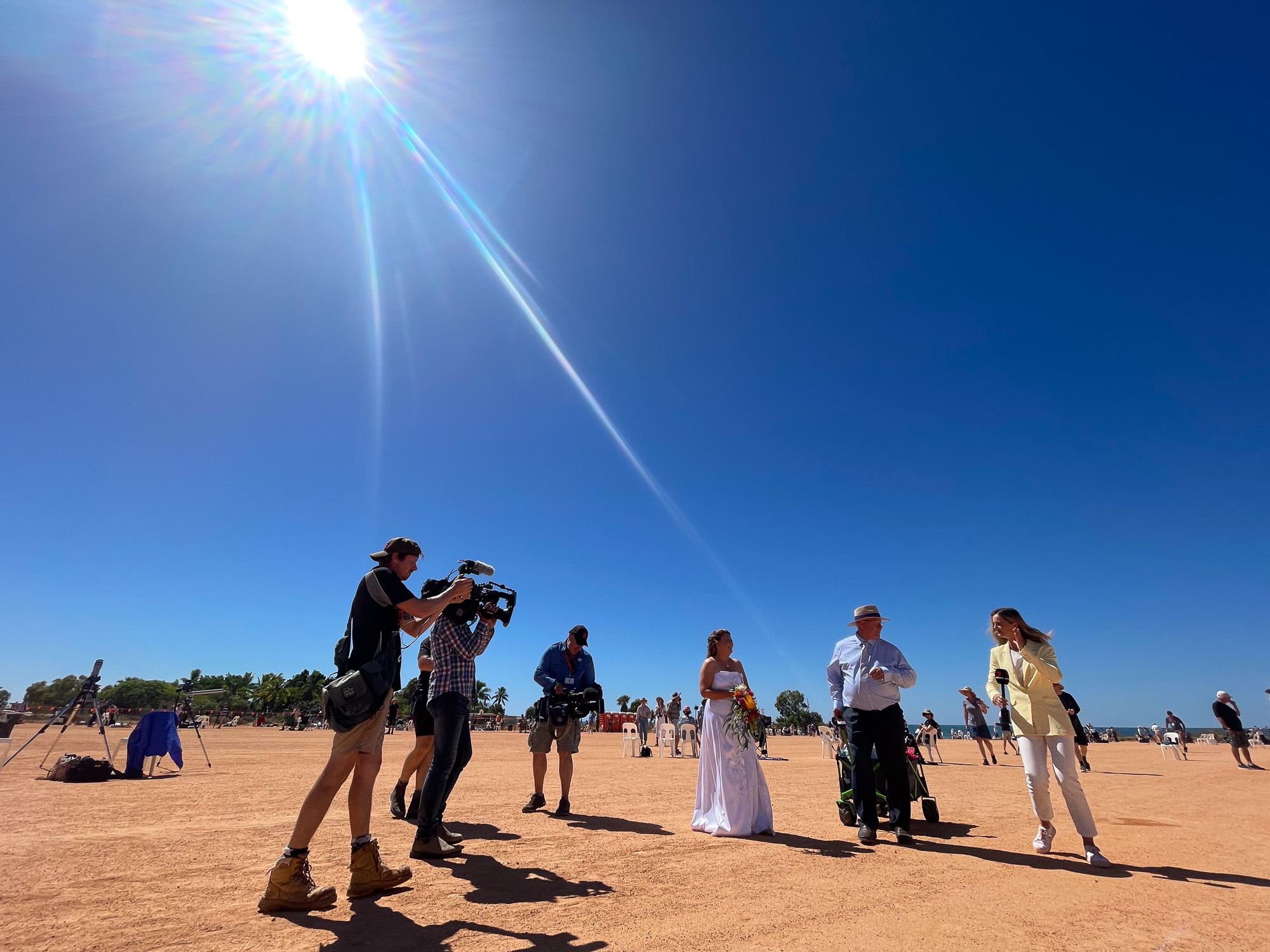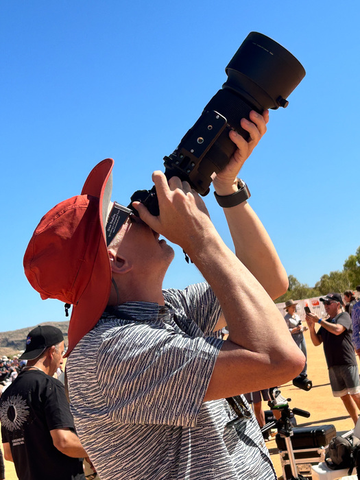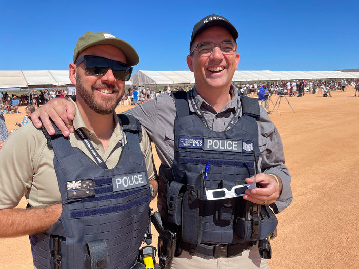 This eclipse was unique for a couple of reasons. First, the path of totality was almost completely over water. The path would pass only briefly over land: first in Exmouth, Western Australia, and a few minutes later over Indonesia and East Timor. Given the much better weather odds in Australia, Vicky set up an eclipse trip to Western Australia. But Exmouth is on a tiny, remote peninsula on the far corner of Australia. There is only one legit town there (population 2806), and the closest major city is Perth, 1200 km away. So, this eclipse would be seen only by a very small group of people. It was kind of the opposite of the 2017 USA eclipse, which passed directly over millions of houses across the US. Second, this was a 'hybrid eclipse,' which really just means that it's very short. During some eclipses the moon is slightly closer to us (giving a large moon, and thus a really long eclipse, up to 7 minutes). During other eclipses the moon will be far enough away from us that it doesn't even cover the entire sun -- and thus an 'annular eclipse.' This hybrid eclipse is just at the sweet spot inbetween these: the sun is covered exactly by the moon. That means it's a pretty short eclipse (in this case, barely a minute) -- but it also means that you see more corona, and more solar prominences and/or flares, since the moon isn't blocking them so much.