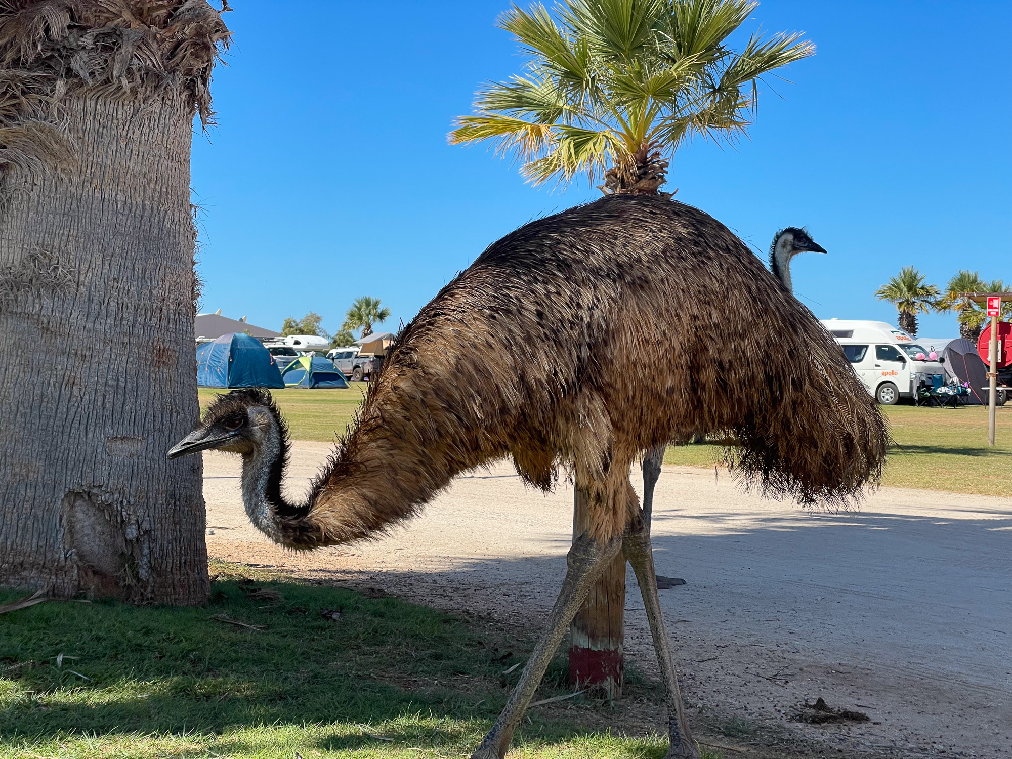 | We've gotten to our northern-most point in Shark Bay, which is a place called Monkey Mia. The emus love walking around the campsites. |