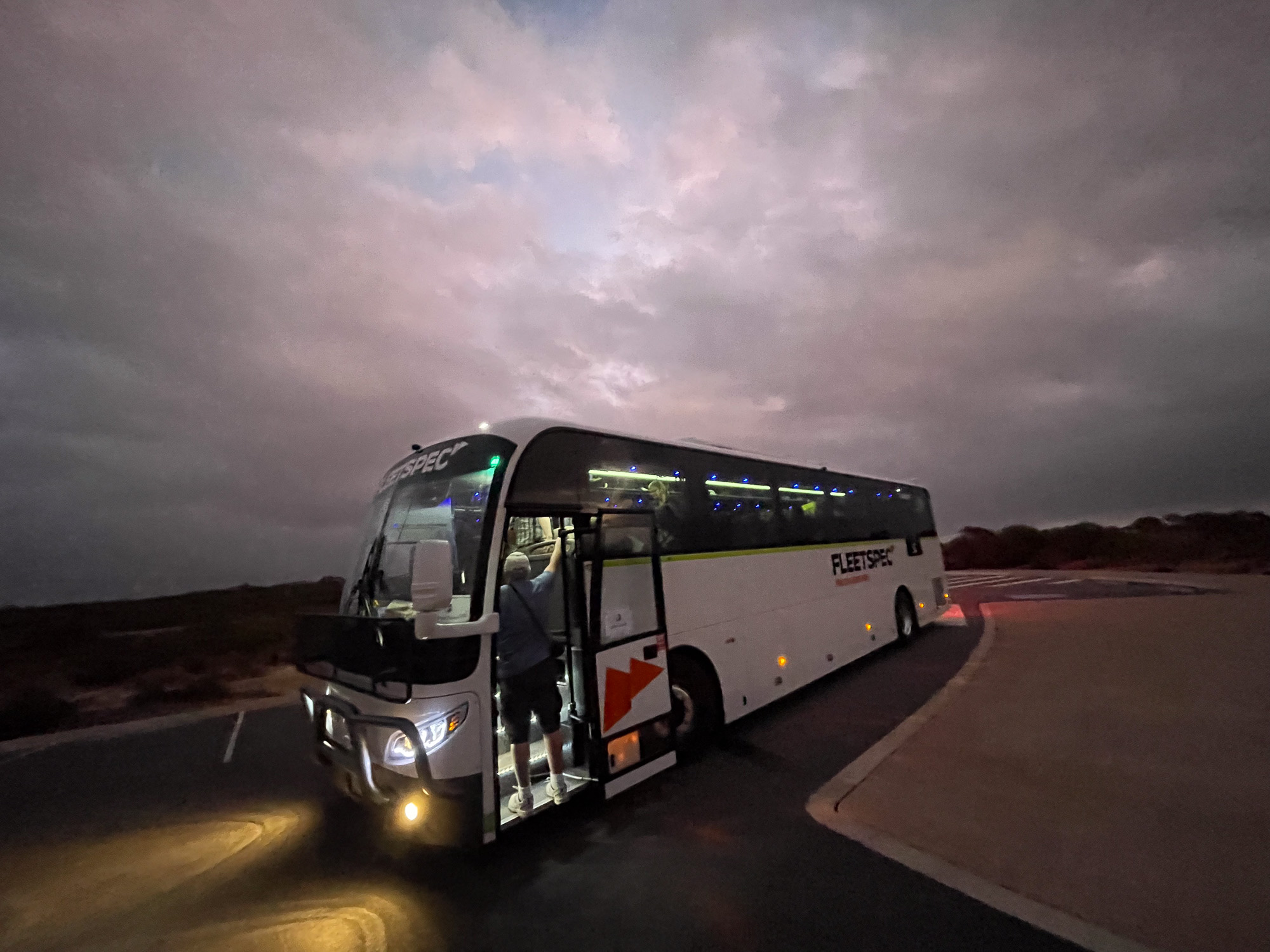 | It's the 4 AM party bus! Bus driver Sam tells us that we're not alone: the title track of AC/DC's Highway to Hell was written about the very road that we're driving on right now (Canning Highway, Perth). |
