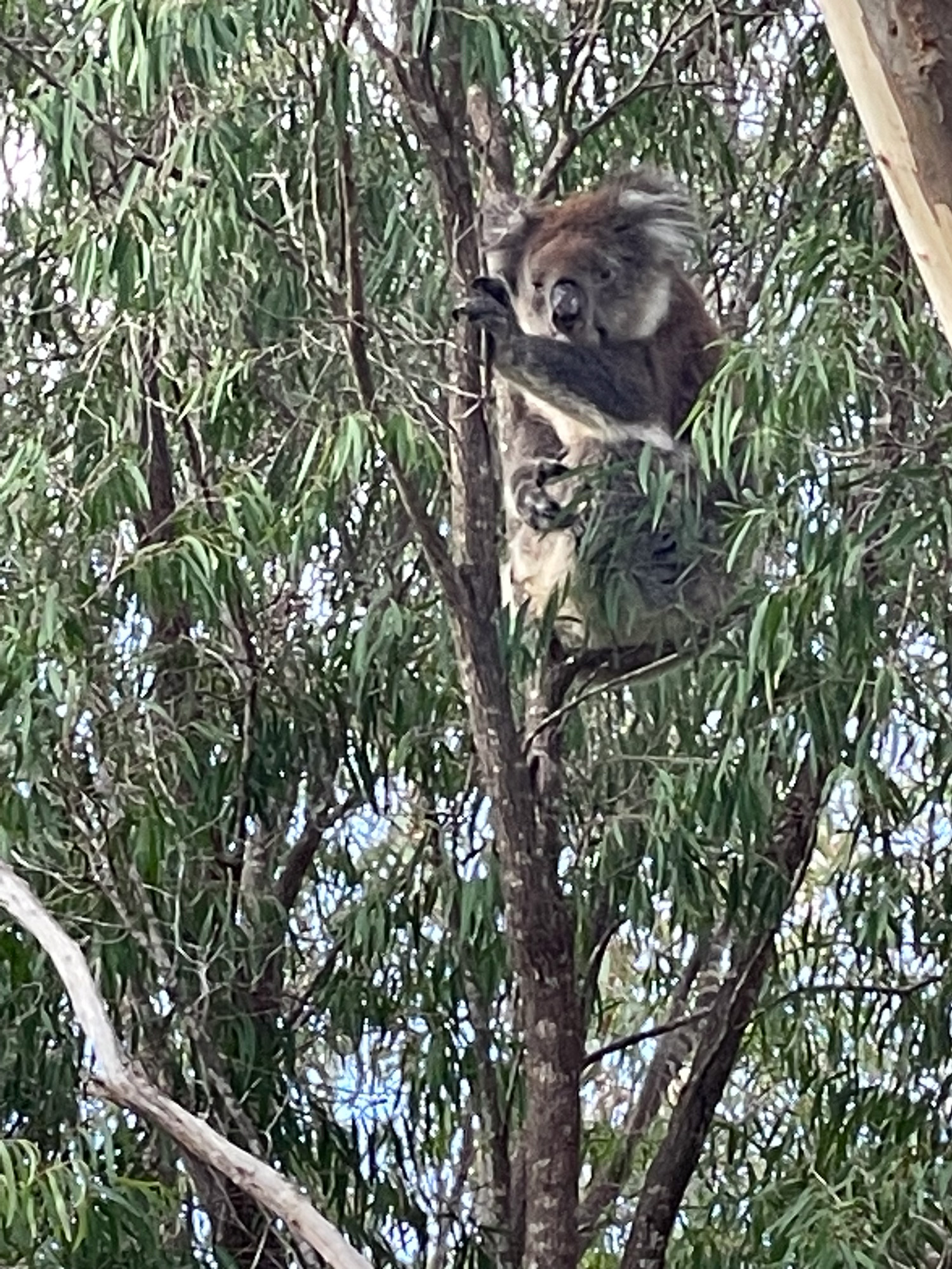 | At the end of the last day, we finally get some koalas! This is at Yanchep National Park. And OK -- the koalas were not exactly wild. There's a fenced region with a boardwalk through it, that had four koalas behing rehabbed in it. The koalas sleep 20-22 hours per day. We could only find three of them. This one was actually moving around! It came down out of the tree. |