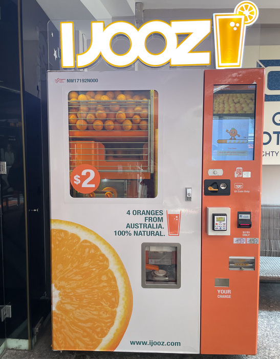 | Look, these OJ dispensers are the best thing in all of Singapore. $2 (which is less than 2 USD) and you get a full cup of cold juice, squeezed in front of you. It's incredible. |