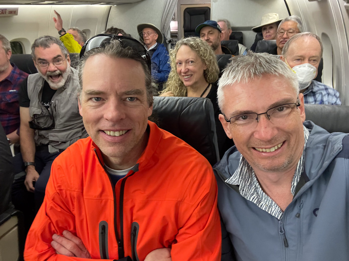 | Travis and I on the plane, with a crowd behind us. Andy and Chell are in the row behind us, with Jeff, Ross, Carey, Anne, and Bruce visible behind them. |