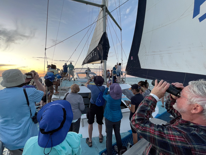 | OK, we're all out on a boat cruise, on a nice catamaran. But hang on: there's a sunset, and a faint crescent moon to look at, so all the binoculars come out! |