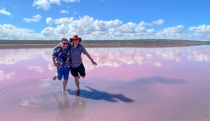 | OK, Todd and I are jumping in the high-salinity lake, Hutt Lagoon. It gets the color from beta carotene and micro-algae. |