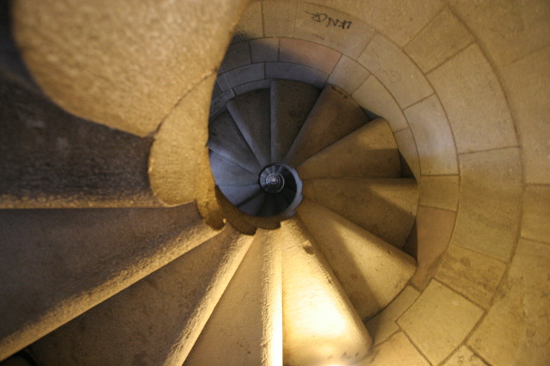 It turns out the staircase is pretty wild. Hundreds of feet high, no central support -- in fact, there's a hole there right down the center. No handrail originally either (although one has been since added for the faint-of-heart).