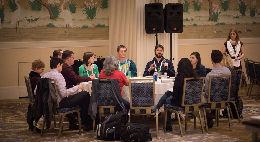 Candace Gray (NMSU / APO, at right) organized the Grad Student + Post-Doc Reception. Several dozen people attended, as well as a handful of senior members to give 'advice'... Nicholas Stamper (U. Tenn) is at the center with the microphone, giving his group's reponse to some great questions about policy and future science goals for the country.