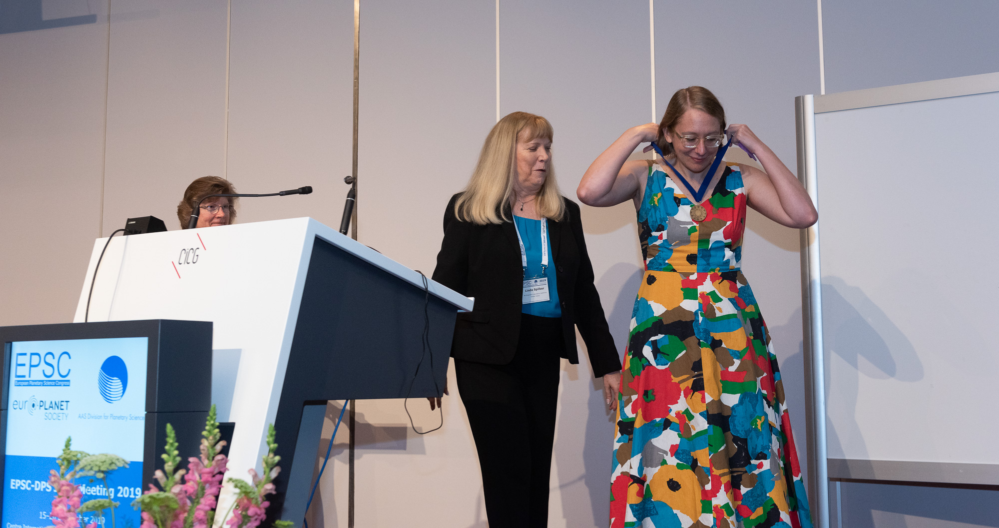 | Maria Zuber (MIT) receives the 2019 DPS Kuiper Prize from DPS chair Linda Spilker |