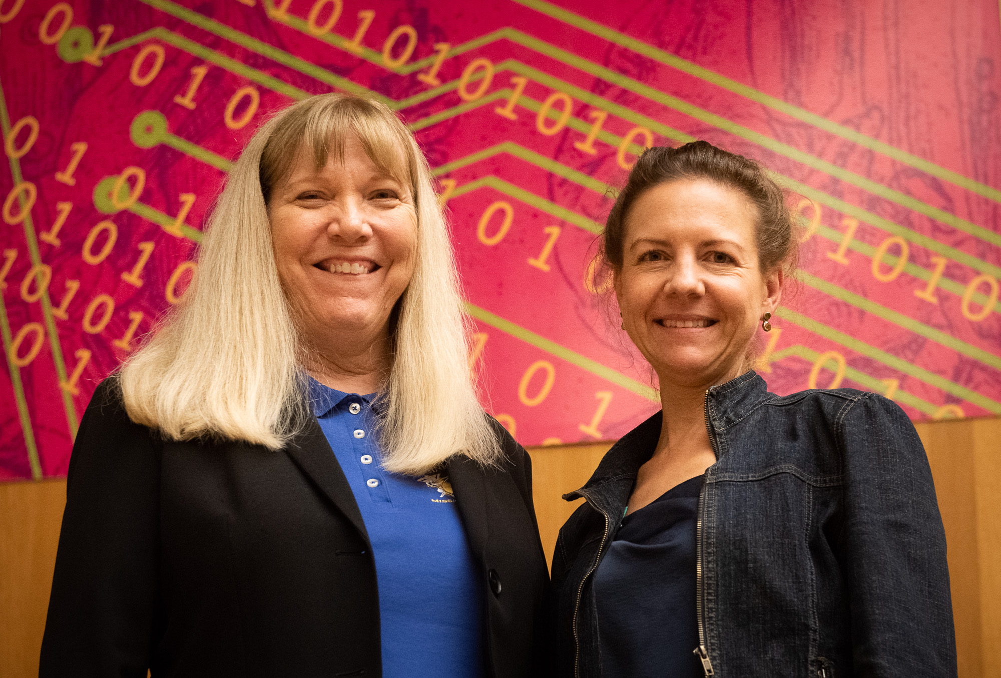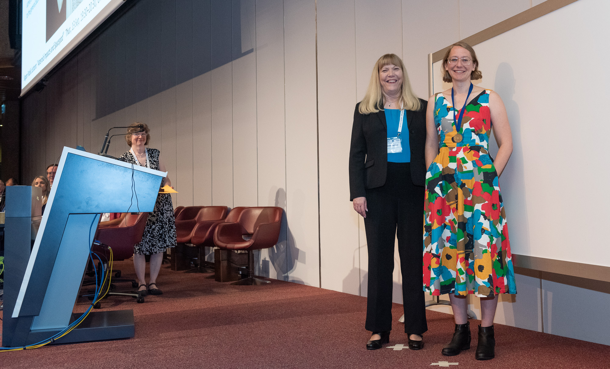 | DSP Chair Linda Spilker with Carrie Nugent, wearing that 2019 Sagan medal. |