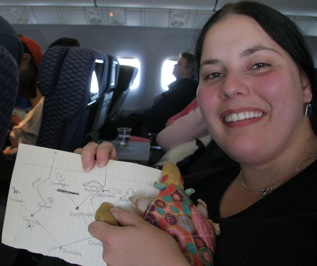 From Newark to Zurich, I was lucky to sit next to Yale paleontologist Michele, who borrowed my ankylosaurus, and gave me a complete family tree of dinosauria. The horizontal line is the KT boundary, beyond which only birds (aka T-rexes) survived.
