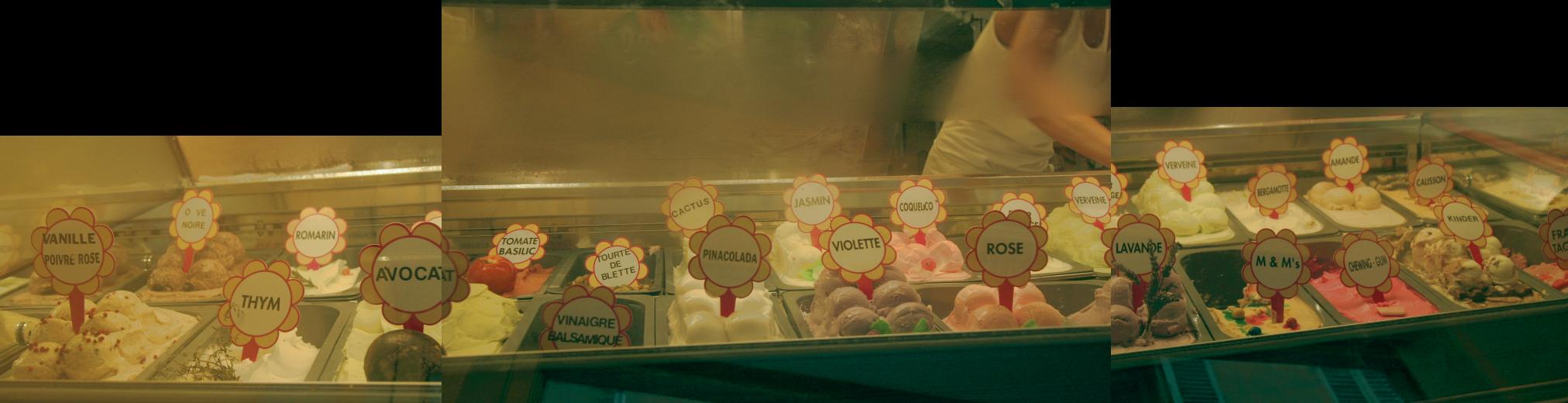 Gelatos of thyme, rosemary, violet, lavendar, avocado, rhubarb, vanilla + red peppercorns, tomato + basil, black olive, balsamic vinegar, fig, cassis...