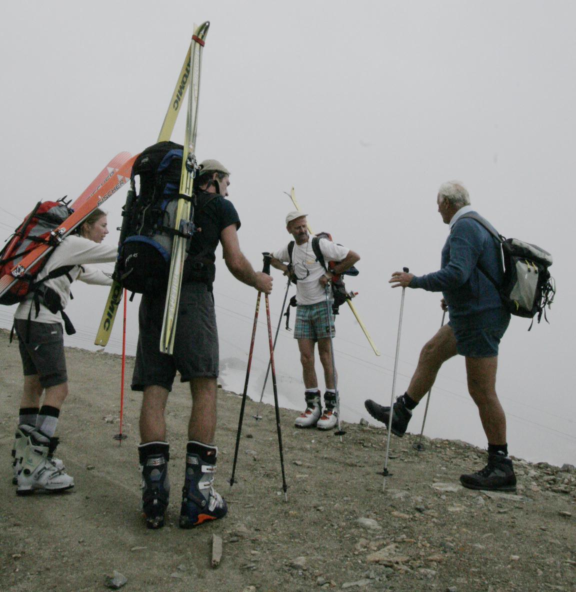 Whoa! Hang on. OK, in Bern, it was 95 deg F, nearly dripping with humidity, and every single Berner was wearing long wool pants. France was the same way. But here we are at 12,000', skiing in a white-out, and these are -- I believe -- the very first shorts I have seen in two weeks in Europe. Four pairs!