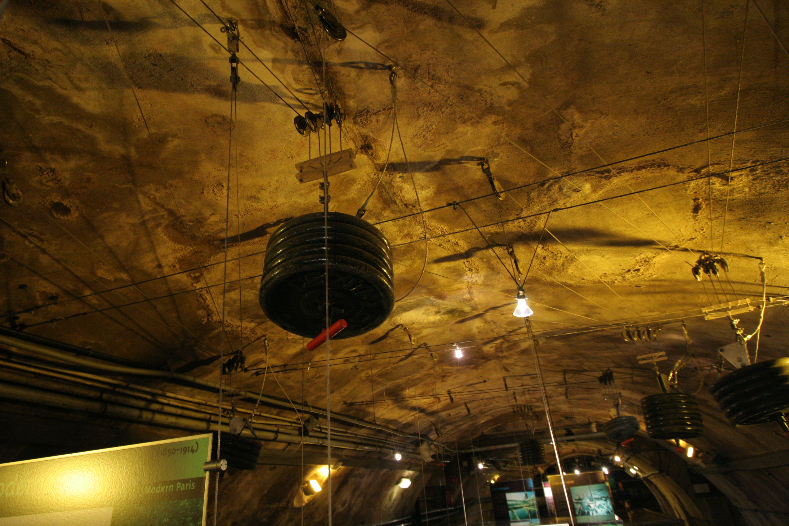 Two weeks earlier, this overflow tunnel was running knee-deep in sewage (really!). Thus, the museum exhibits are on fancy cables and pulleys, to allow them to be raised up and down for their own protection.