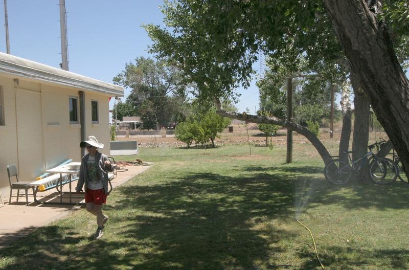 JMT has adjusted the superintendent's sprinkler to water his roses. We pack up bikes behind the house.