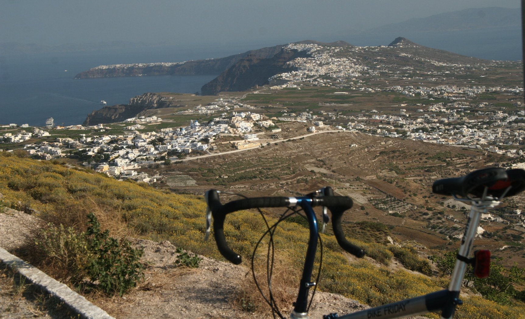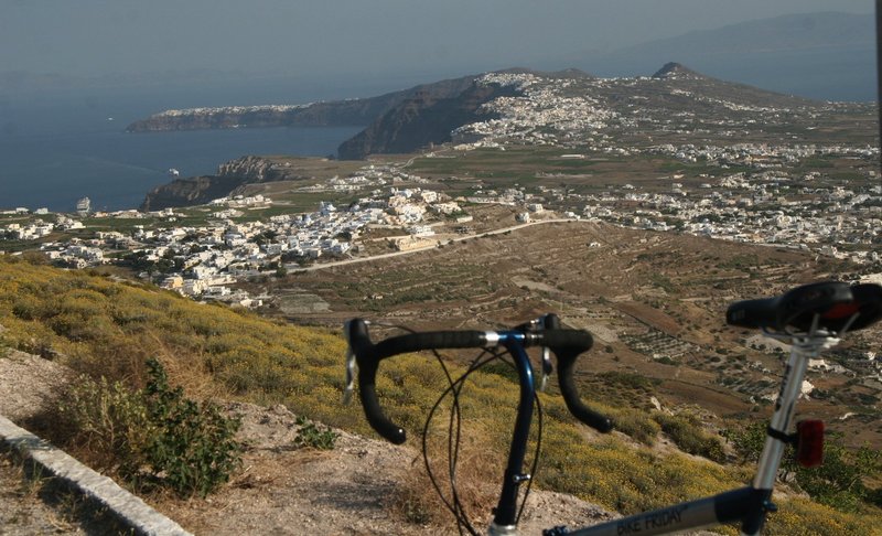 It was an hour or so to the peak. Thira is the large city at the center (pop. 3000 or so). Oia is the town along the ridgeline at the distant left. There are some other islands visible in the far distance. You can see pretty much all of Santorini here; the islad itself might be 15 miles tip-to-tip.