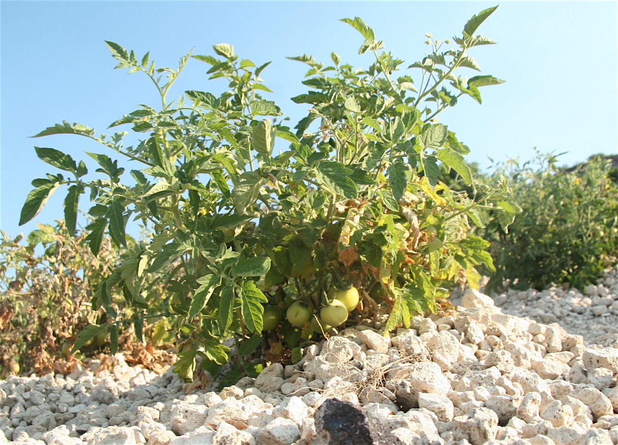 OK! The Famous Santorini Tomato. Just like the grapes, they're all `dry-farmed,' and never watered, since there is no water around to do so with. You get kind of hard and pasty (but very flavorful!) tomatoes by the end, and use them in salads. Apparently they're hip in Bay Area farmers' markets these days, too.