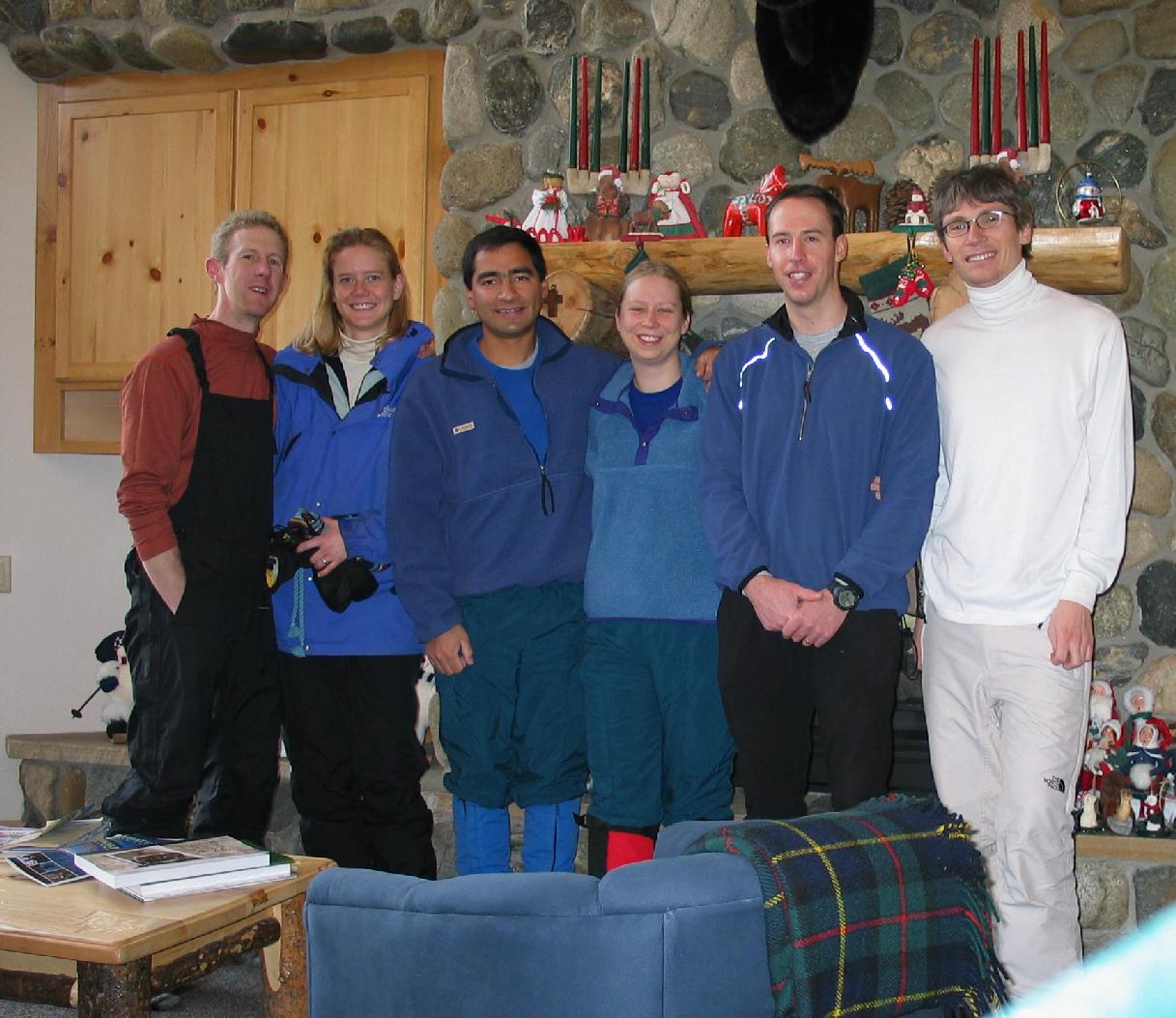 We enjoy the warmth of the heated floors and the hot tub at the world-famous Christmoose Lodge, Breckenridge. Personnel (from left): Dan, Laura, Evaristo, Kathy, Dana, HBT.