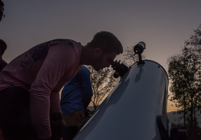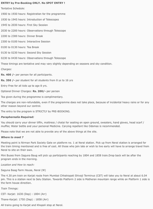 But in scoping out the astronomy scene before we got here, I came across the web page of an amateur astronomy group, Khagol Mandal ('Cosmos Club', in the local Marathi). Their Indian form of 'star party' looked incredible, down to the very detailed instructions of which trains to take, and a minute-by-minute observation plan including midnight dinner and 3 AM tea break. Up until now, I hadn't crossed paths with them. But as luck had it, they invited me to give a talk, and one of my colleagues was taking her Astrobiology class there for the night, so I headed out to their dark-sky site about two hours outside of Mumbai for their all-night star party.