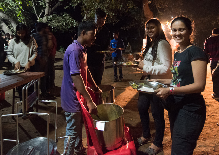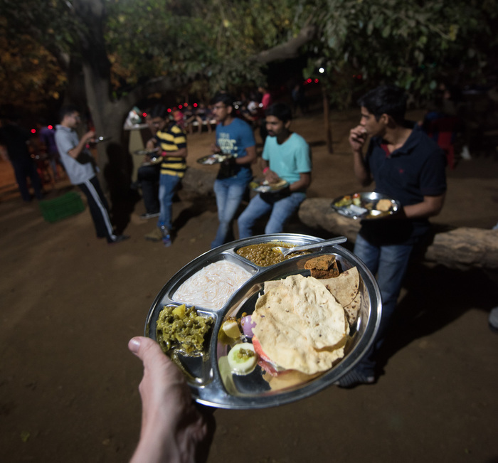| After a couple hours of observing, it's time for a midnight dinner! Dal, rice, roti, some sweet noodles, some green veg paneer, halwa, carrots, raw onions, chutney, and more. |